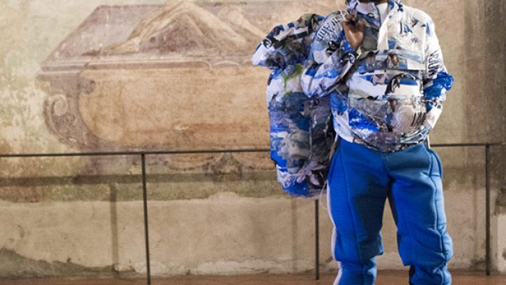 La collezione vede alcuni capi realizzati con applicazioni di imballaggi riciclati; il capo principale della collezione è il piumino oversize interamente realizzato di cellophane ed imballaggi riciclati.