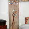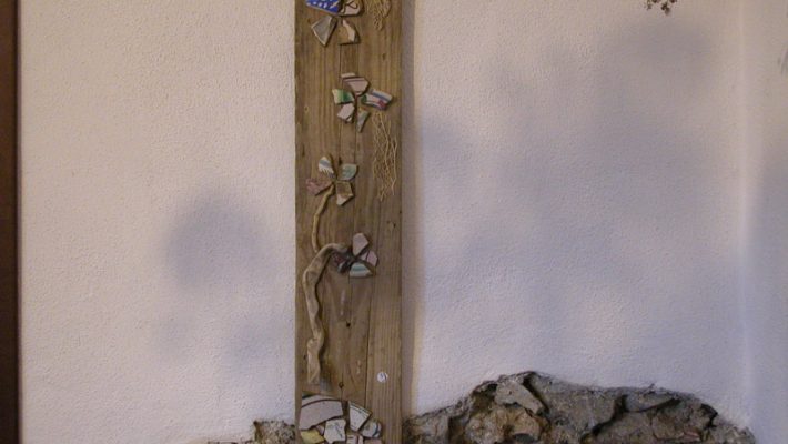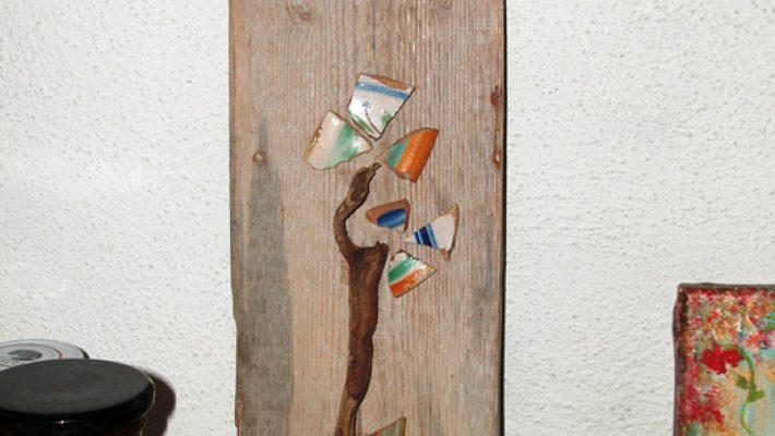 Realizzo immagini fotografiche della flora autoctona e non, che con la mia Nikon catturo nei minimi particolari andando per erbe . Sono pure creatrice di opere di riciclo del mio proprio ingegno. Dopo anni di soggiorno all’estero ho vissuto 12 anni tra la Germania ed il basso Cilento (Salerno) e dal 2015 sono in Abruzzo, alle antiche origini. Lavorando a vari orti sinergici in Cilento, ho trovato tanti frammenti di piatti, caraffe, ciotole antichi (probabilmente buttati negli orti per via dell’arrivo di quelli industriali o semplicemente perché rotti), nelle cantine o nei campi abbandonati ho trovato assi di castagno, di quercia, … e così ho iniziato il mio cammino nel 2007. I pezzi di ceramica vengono incollati al legno con “colla di bue” (pure conosciuta come “colla forte”) usata dai tempi dei tempi da restauratori e completamente naturale; gli agganci me li preparava Vito, il caro fabbro del paesino in Cilento, in ferro battuto. Oggi Angelo un fabbro di Sulmona (AQ).