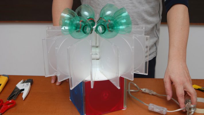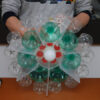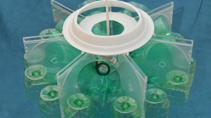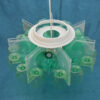 Elaborati sfruttando lo scarto delle bottiglie di plastica, dividendole in grandezza, colore, e forma, engono poi accoppiate a strutture centrali come le confezioni del gelato, i coperchi dei multi contenitori dei CD o DVD, piatti di plastica e le cover dei CD o DVD inutilizzati. L’assemblaggio in alcuni casi molto rapido con l’utilizzo di una pinzatrice e delle colle, si alterna a momenti di attesa per l’utilizzo a rinforzo di elementi che devono essere incollati, quindi necessitano asciugature un pò lunghe. Alcuni elementi vengono lavorati con uno svasatore, praticando un foro centrale al quale si applica il bulbo che reggerà la lampadina.